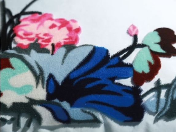 11、植絨成品線絨平滑、均勻。繡線穿透織物緊勾固定,經過背膠處理后牢固可靠。